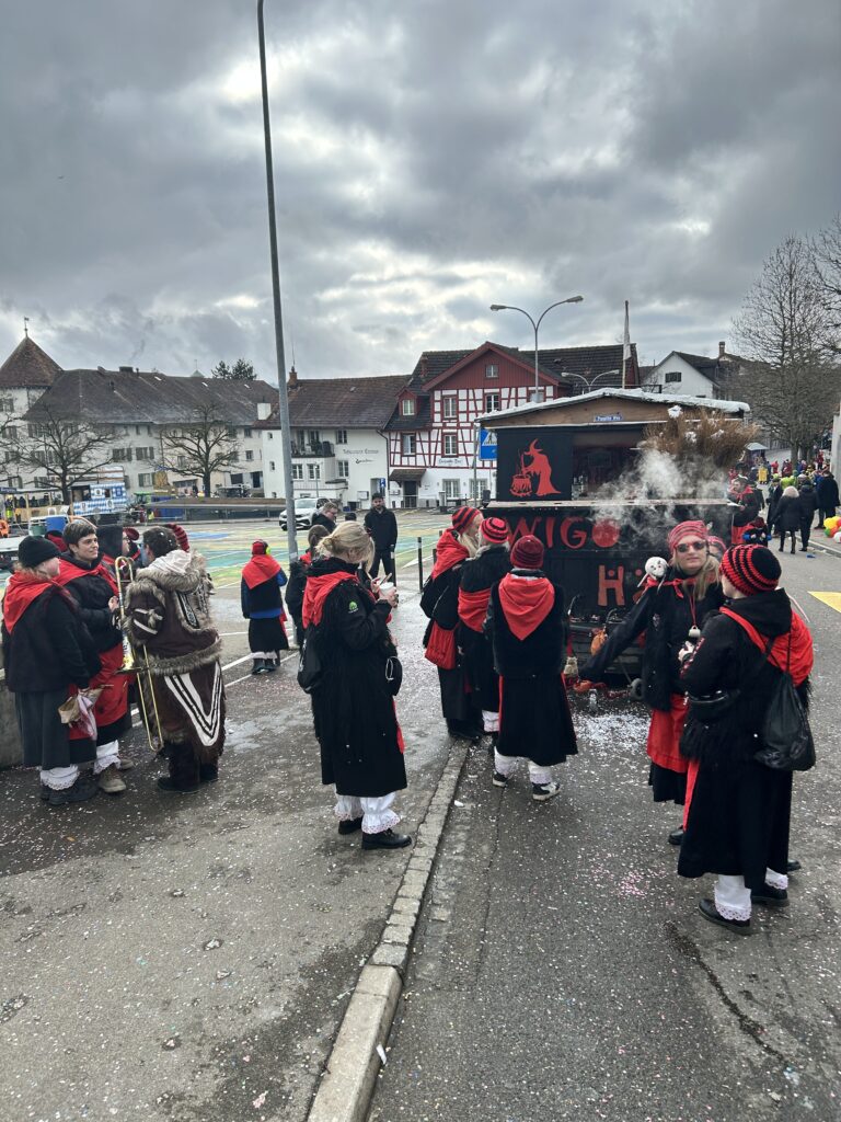 Mit dem Zug angereist, voller Vorfreude – und dann begann unsere erste Disziplin des Tages: Wagen-Safari. Am ursprünglichen Treffpunkt? Kein Wagen. Also marschierten wir der Strasse entlang, suchten, spähten, kombinierten… bis wir ihn endlich fanden. Unser Hexenbauwagen stand eingeklemmt zwischen zwei anderen Fasnachtswagen – oben laute Musik, unten laute Musik. Sagen wir es so: Unsere Ohren hatten sofort Fasnacht.